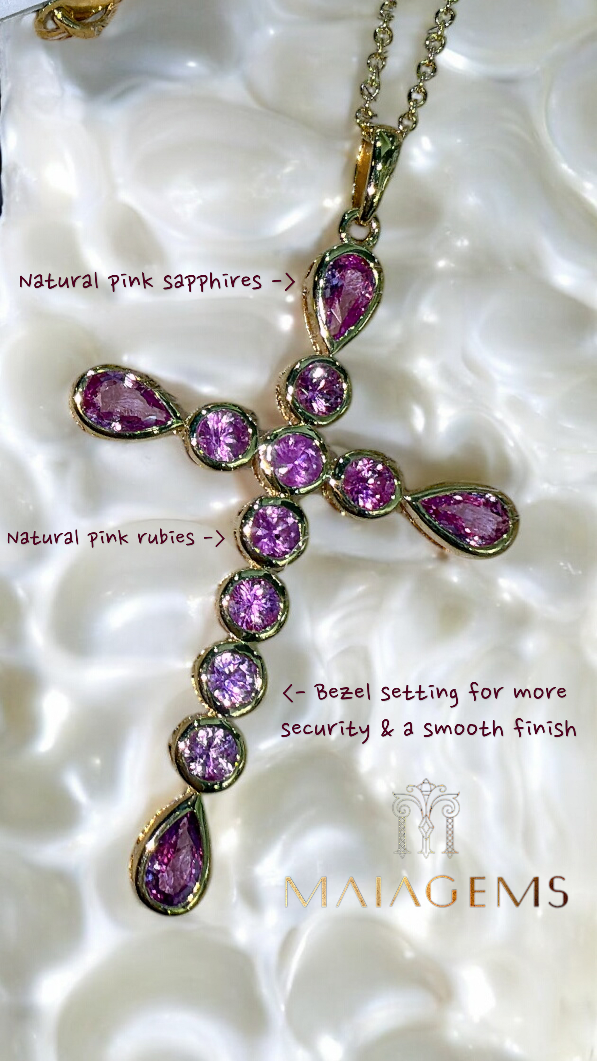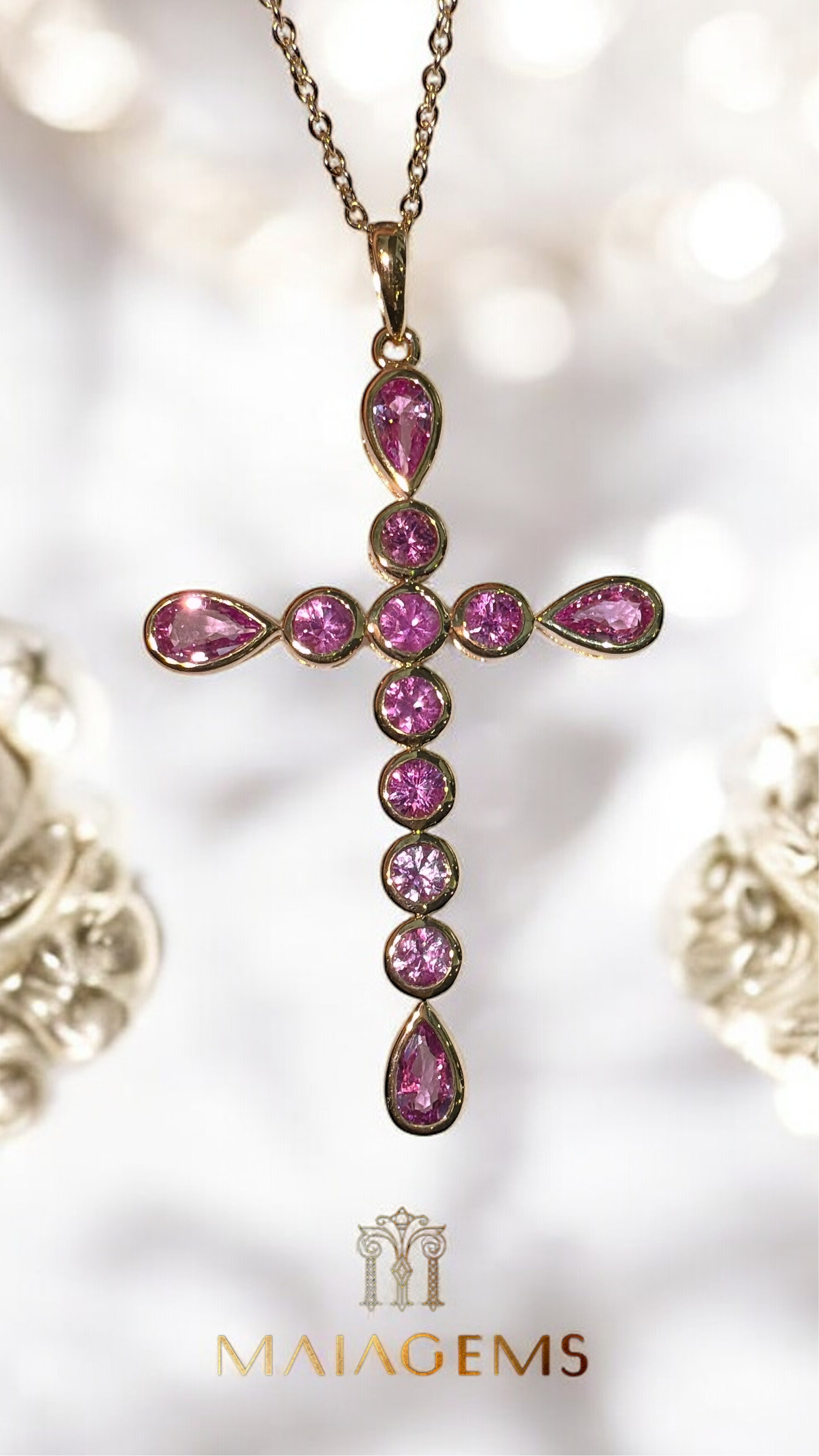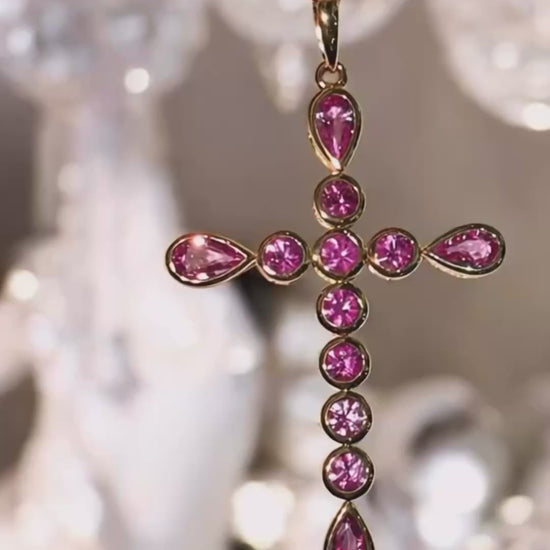 Elysian Cross is an exquisite necklace featuring a sleek, bezel-set design, adorned with opulent pink sapphires and rubies. Inspired by Aphrodite, the goddess of love, this piece embodies transformation and joy, effortlessly elevating your jewelry collection.