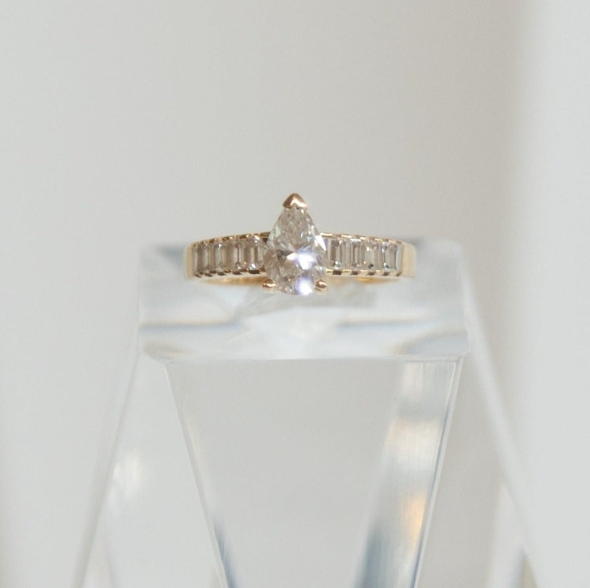 Introducing the Serenity Ring – a mesmerising fusion of celestial beauty and mythical grace. This exquisite ring captures the essence of Aphrodite's tear, transforming it into a radiant masterpiece that speaks to the profound emotions that bind humanity. At its core, a tear-shaped diamond shimmers with ethereal elegance, surrounded by a delicate array of baguette-cut diamonds that illuminate its journey like moonlit pathways.