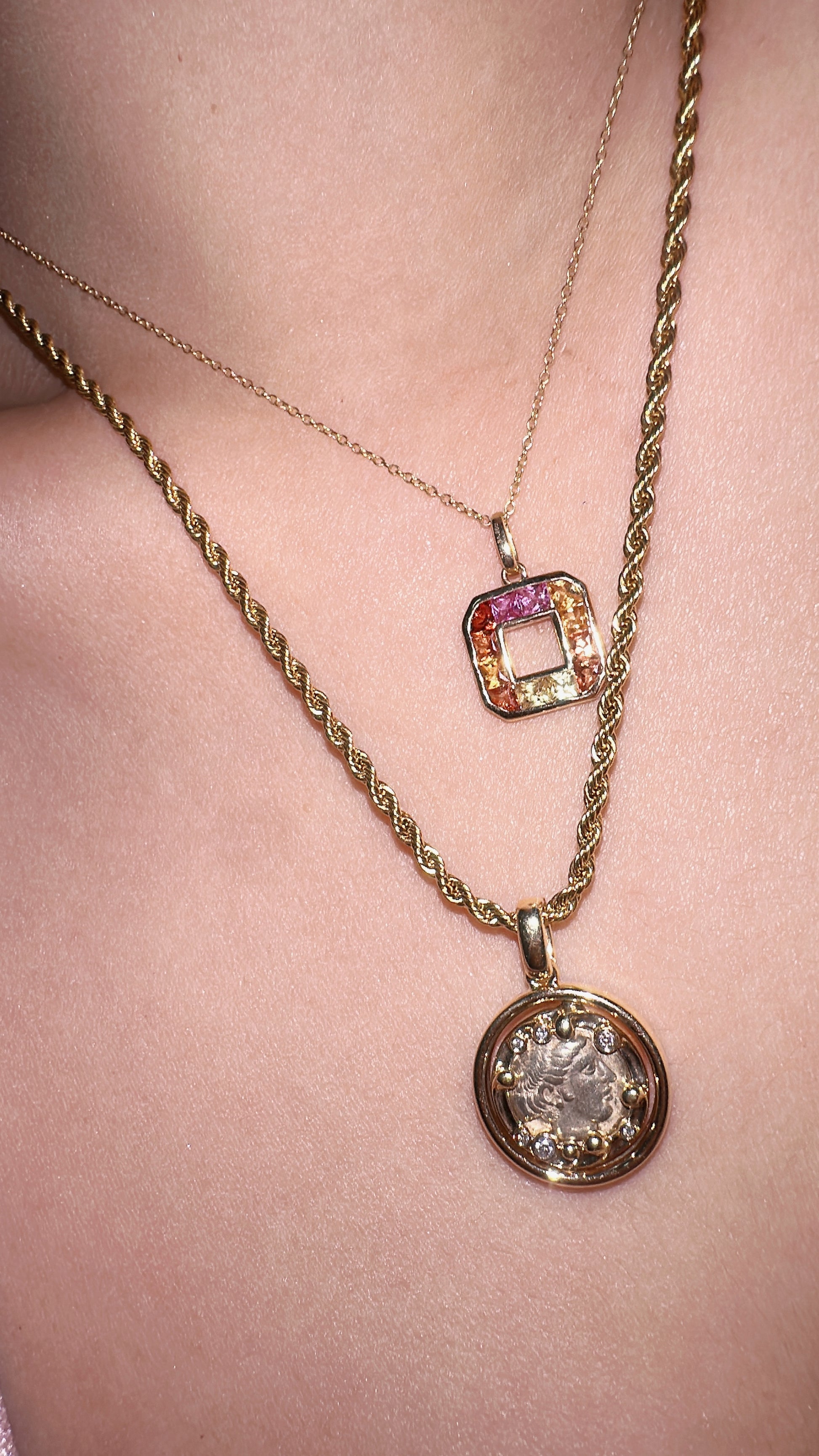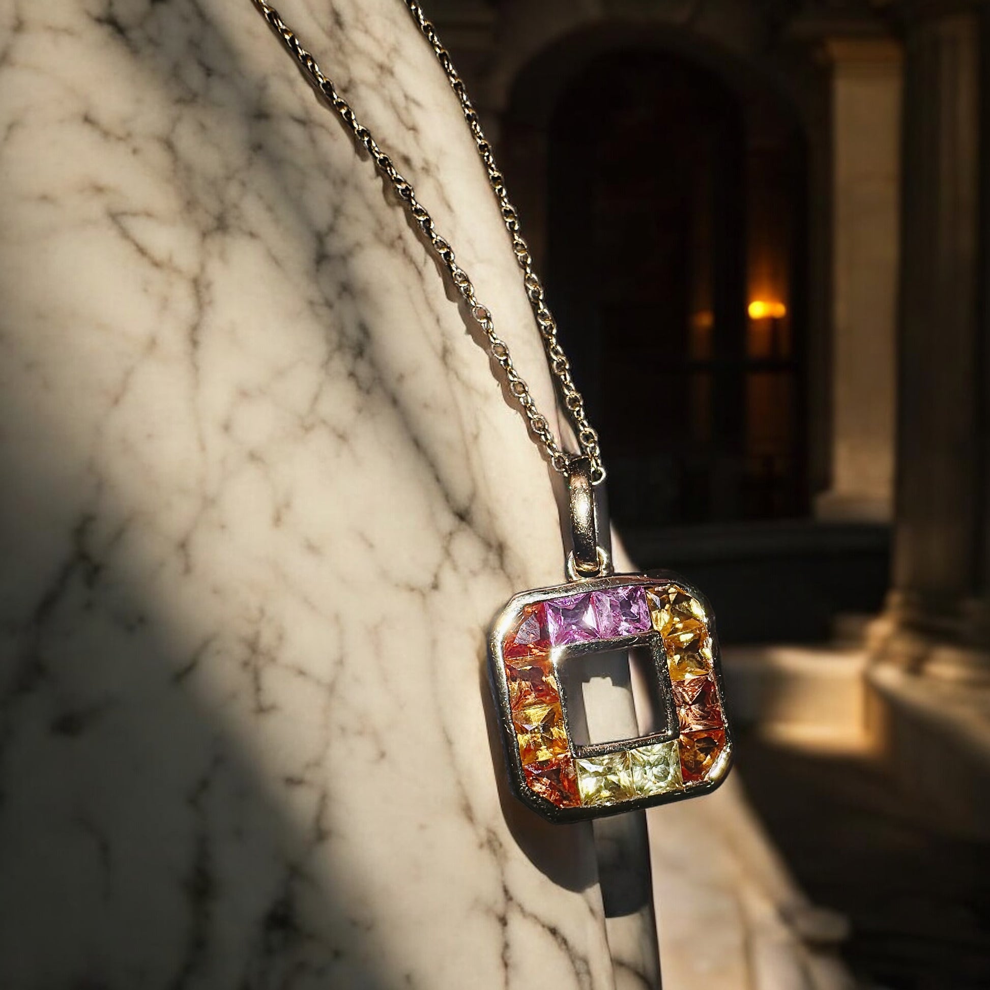 The prism pendant features a necklace adorned with 12 colorful blue sapphires, crafted in 18K gold and weighing 1.26 carats. This piece embodies mystery and elegance, symbolizing inner exploration and self-reflection.